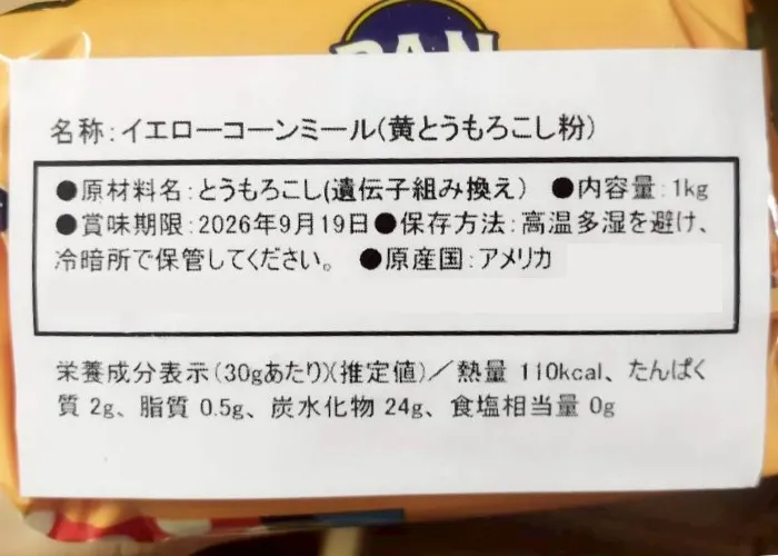 | 原材料名 | 黄色とうもろこし(遺伝子組み換え)/ビタミンミックス(鉄、VB3、VB1、VB2、VB9、リン酸三Ca) |