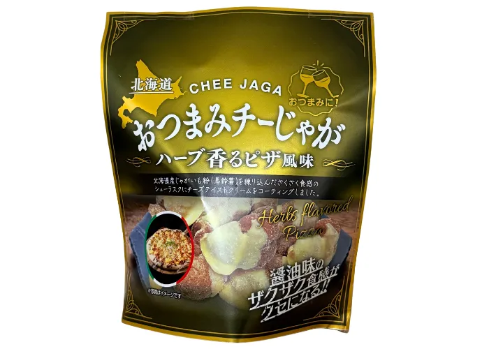 北海道産馬鈴薯粉を配合した醬油シューラスクにチーズをコーティングしハーブパウダーとバジルパウダーをかけました。