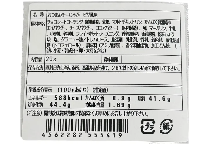 | 原材料名 | チョコレートコーチング(植物油脂、乳糖、マルトデキストリン、たんぱく質濃縮ホエイパウダー、チーズパウダー、ココアバター)(国内製造)卵、マーガリン、牛乳、小麦粉、全粒粉、フライドポテトシーズニング、香辛調味料、馬鈴薯粉、粉末しょうゆ、塩、グラニュー糖/トレハロース、膨張剤、乳化剤、香料、着色料、酸化防止剤(トコフェロール)、調味料(アミノ酸等)、香辛料抽出物、加工でん粉、(一部に小麦・乳成分・卵・大豆を含む) |