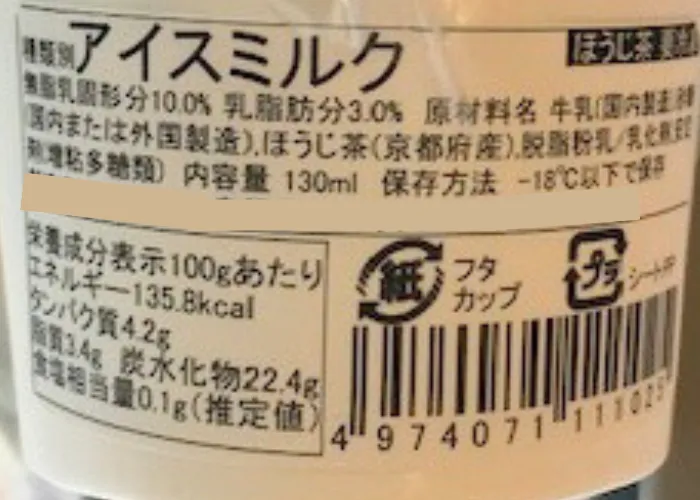 | 原材料名 | 牛乳(国内製造)・砂糖(国内製造)・ほうじ茶(京都産)・脱脂粉乳/乳化剤・安定剤(増粘多糖類) 種類別:アイスミルク、無脂乳固形分 10.0% 乳脂肪分 3.0% |