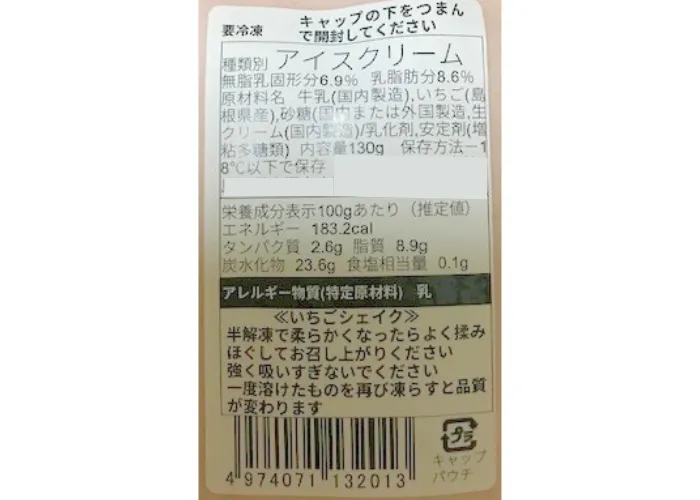 | 原材料名 | 牛乳(国内製造)・いちご(島根県産)・砂糖(国内製造)・生クリーム(国内製造)/乳化剤・安定剤(増粘多糖類) 種類別:アイスクリーム、無脂乳固形分 6.9% 乳脂肪分 8.6% |