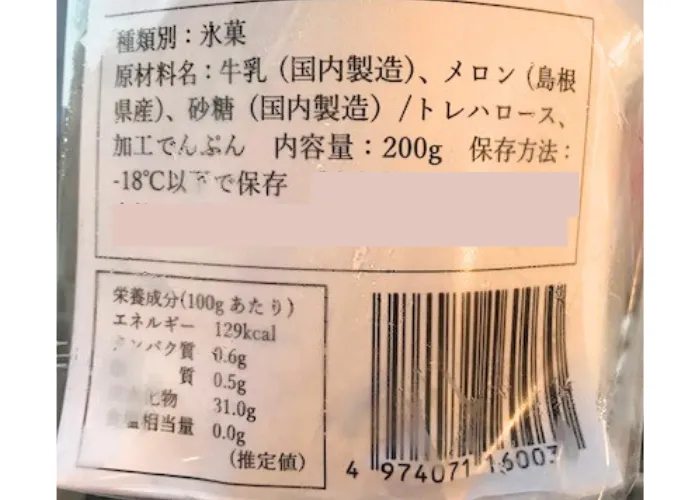 | 原材料名 | 牛乳(国内製造)・メロン(島根県産)・砂糖(国内製造)/トレハロース・加工でんぷん 種類別:氷菓 |