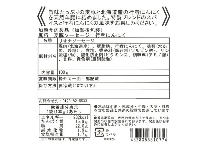 | 原材料名 | 豚肉(北海道産)、豚脂肪、行者にんにく、糖類(水あめ、砂糖)食塩、香辛料/保存料(ソルビン酸)、リン酸塩(Na)、酸化防止剤(ビタミンC)、調味料(アミノ酸)、香料、発色剤(亜硝酸Na) |