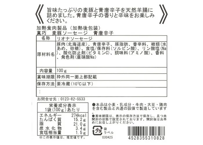 | 原材料名 | 豚肉(北海道産)、青唐辛子、豚脂肪、香辛料、糖類(水あめ、砂糖)、食塩/保存料(ソルビン酸)、リン酸塩(Na原材料名)、酸化防止剤(ビタミンC)、調味料(アミノ酸)、香料、発色剤(亜硝酸Na) |