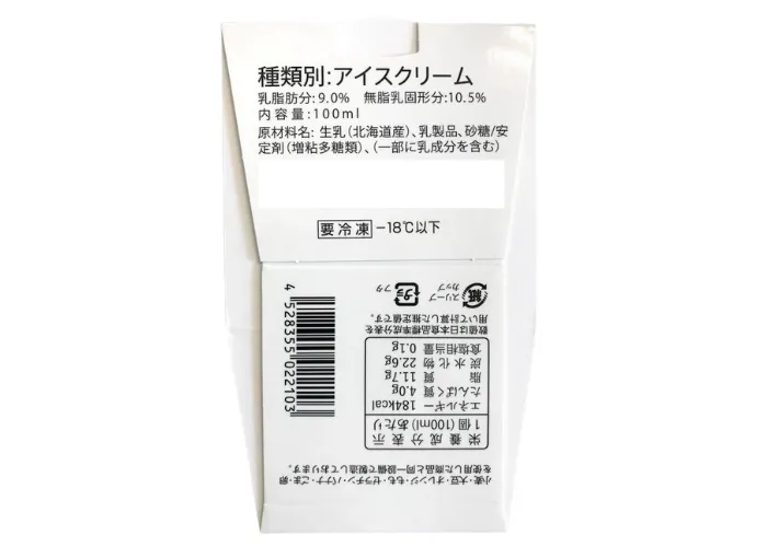 | 原材料名 | 生乳(北海道産)、乳製品、砂糖/安定剤(増粘多糖類) 種類別:アイスクリーム、乳脂肪分 9.00% 無脂乳固形分 10.50% |