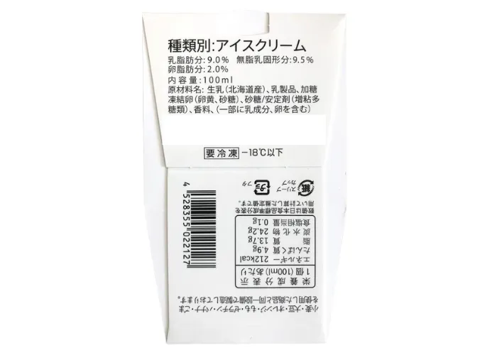 | 原材料名 | 生乳(北海道産)、乳製品、加糖凍結卵(卵黄、砂糖)、砂糖/安定剤(増粘多糖類)、香料 種類別:アイスクリーム、乳脂肪分 9.0% 無脂乳固形分 9.5% |