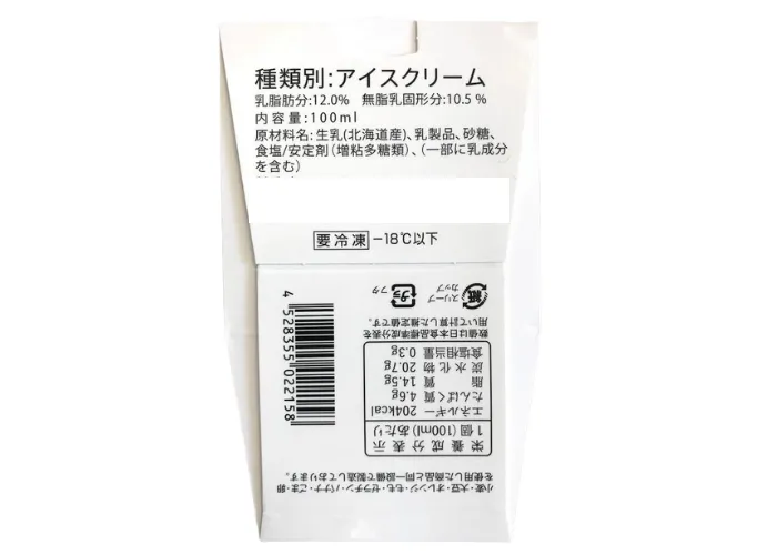 | 原材料名 | 生乳(北海道産)、乳製品、砂糖、食塩/安定剤(増粘多糖類) 種類別:アイスクリーム、乳脂肪分 12.00% 無脂乳固形分 10.5% |