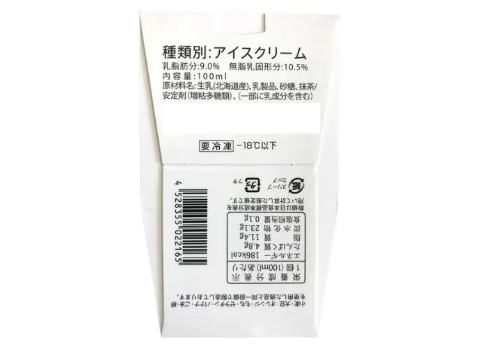 | 原材料名 | 生乳(北海道産)、乳製品、砂糖、抹茶/安定剤(増粘多糖類) 種類別:アイスクリーム、乳脂肪分 9.0% 無脂乳固形分 10.5% |