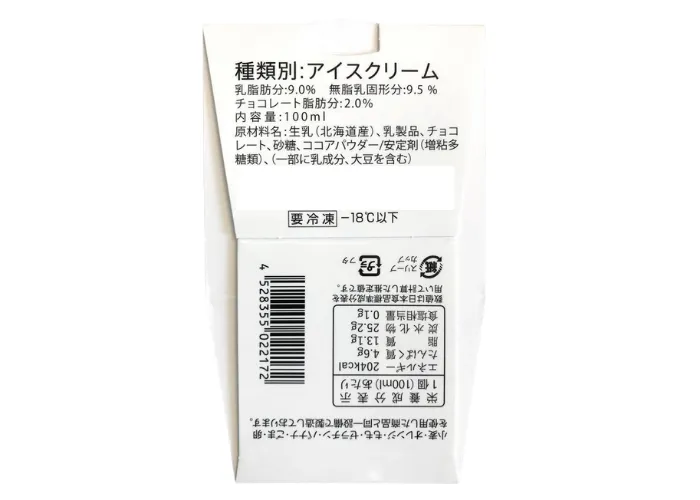 | 原材料名 | 生乳、乳製品、チョコレート、砂糖、ココアパウダー/安定剤(増粘多糖類)、乳化剤、香料 種類別:アイスクリーム、乳脂肪分 9.0% 無脂乳固形分 9.5% |