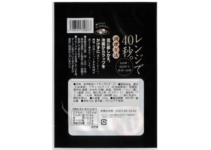 | 原材料名 | 豚肉(北海道産)、ナチュラルチーズ(北海道製造)、豚脂肪、香辛料、糖類(水あめ、砂糖)、食塩/保存料(ソルビン酸)、リン酸塩(Na)、酸化防止剤(ビタミンC)、調味料(アミノ酸)、くん液、発色剤(亜硝酸Na)、(一部に乳成分·豚肉を含む)● |
