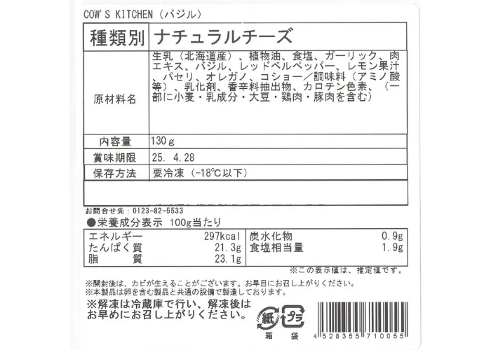 | 原材料名 | 生乳(北海道産)、植物油、食塩、ガーリック、肉エキス、バジル、レッドベルペッパー、レモン果汁、パセリ、オレガノ、コショー/調味料(アミノ酸等)、乳化剤、香辛料抽出物、カロチン色素、(一部に小麦·乳成分·大豆·鶏肉·豚肉を含む) |