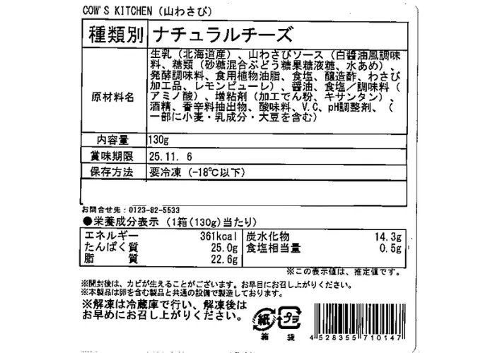 | 原材料名 | 生乳(北海道産)、山わさびソース(白醬油風調味料、糖類(砂糖混合ぶどう糖果糖液糖、水あめ)発酵調味料、食用植物油脂、食塩、醸造酢、わさび加工品、レモンピューレ)、醤油、食塩/調味料(アミノ酸)、増粘剤(加工でん粉、キサンタン)酒精、香辛料抽出物、酸味料、V.C、pH調整剤、(一部に小麦·乳成分·大豆を含む) |