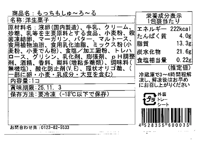 | 原材料名 | 液卵(国内製造)、牛乳、クリーム、砂糖、乳等を主要原料とする食品、小麦粉、殺菌凍結卵、マーガリン、バター、マルトース、食用植物油脂、食用乳化油脂、ミックス粉(小麦粉、小麦でん粉)、食塩/加工澱粉、トレハロース、グリシン、乳化剤、膨張剤、pH調整剤、酒精、香料、糊料(増粘多糖類)、調味料(無 機 塩 ) 、 酸化防止剤(V.E)、環状オリゴ糖 |