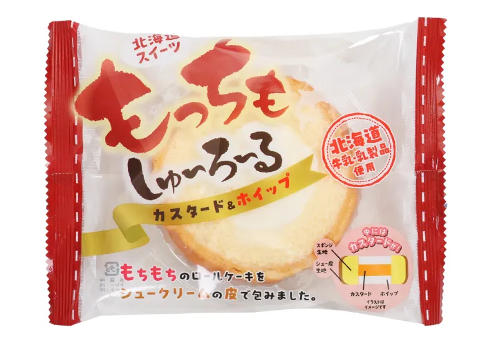 王道スイーツのシュークリームとロールケーキがひとつになりました! シュー生地で巻いたスポンジケーキの中には、ホイップクリームでサンドしたカスタードクリームがたっぷり!