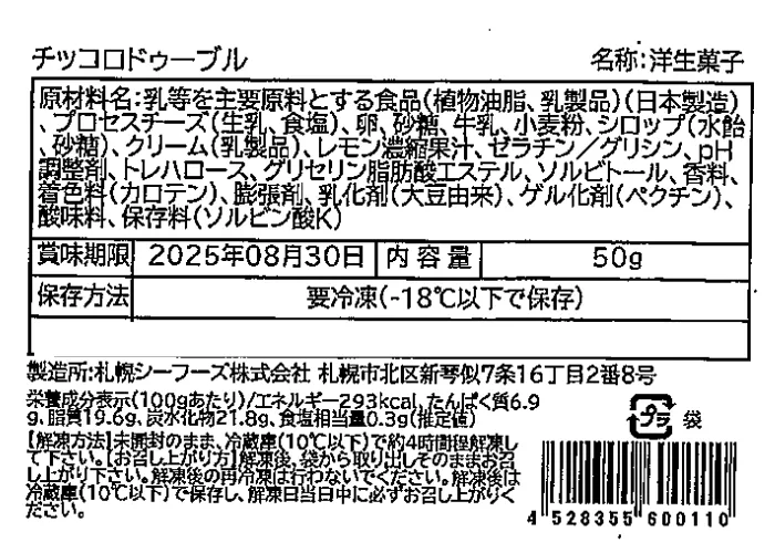| 原材料名 | 乳等を主要原料とする食品(植物油脂、乳製品)(日本製造)、プロセスチーズ(生乳、食塩)、卵、砂糖、牛乳、小麦粉、シロップ(水飴、砂糖)、クリーム(乳製品)、レモン濃縮果汁、ゼラチン/グリシン、PH調整剤、トレハロース、グリセリン脂肪酸エステル、ソルビトール、香料、着色料(カロテン)、膨張剤、乳化剤(大豆由来)、グル化剤(ペクチン)、酸味料、保存料(ソルビン酸K) |