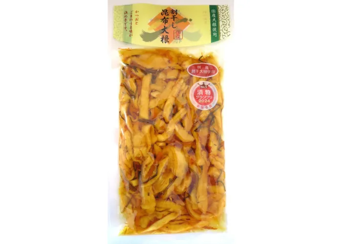漬物グランプリ2024年金賞受賞商品。割干大根と人参は国産原料を使用。ほど良い歯応えと大根に染みこんだ甘辛めの味付で飽きが来ない割干漬です。