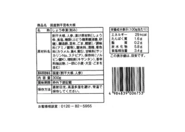 | 原材料名 | 割干大根、人参、漬け原材料〔しょうゆ、食塩、糖類(ぶどう糖果糖液糖、砂糖)、昆布、ごま、鰹節〕/調味料(アミノ酸等)、酸味料、酒精、着色料(カラメル、黄4、黄5)、甘味料(サッカリンNa、ステビア)、保存料(ソルビン酸K)、増粘剤(キサンタン)、香辛料抽出物、(一部に小麦・大豆・ごまを含む) |