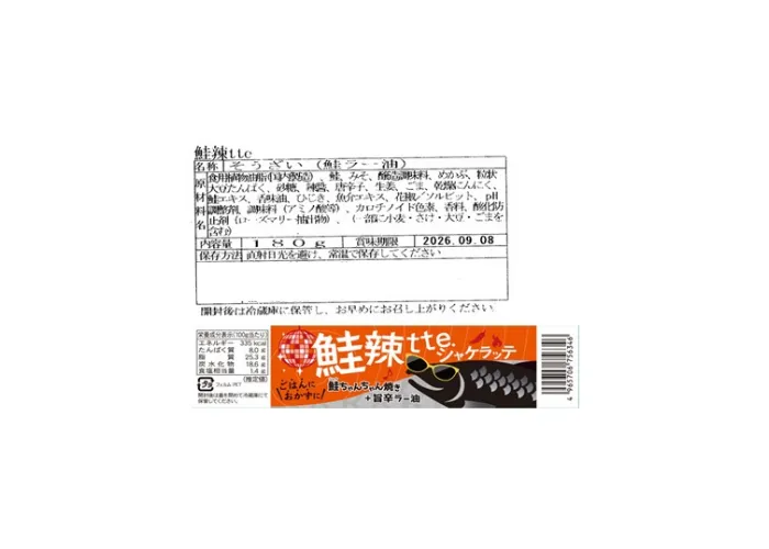 | 原材料名 | 食用植物油脂(国内製造)、鮭、みそ、醸造調味料、めかぶ、粒状大豆たんぱく、砂糖、辣醤、唐辛子、生姜、ごま、乾燥にんにく、鮭エキス、香味油、ひじき、魚介エキス、花椒/ソルビット、ph調整剤、調味料(アミノ酸等)、カロチノイド色素、香料、酸化防止剤(ローズマリー抽出物)、(一部に小麦・さけ・大豆・ごまを含む) |