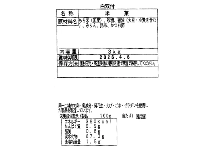| 原材料名 | もち米(国産)、砂糖、醤油(大豆・小麦を含む)、みりん、昆布、かつお節 |