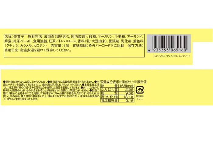 | 原材料名 | 液卵白(卵を含む、国内製造)、砂糖、マーガリン、小麦粉、アーモンド、蜂蜜、紅茶ペースト、食用油脂、紅茶/トレハロース、香料(乳・大豆由来)、膨張剤、乳化剤、着色料(クチナシ、カラメル、カロテン) |