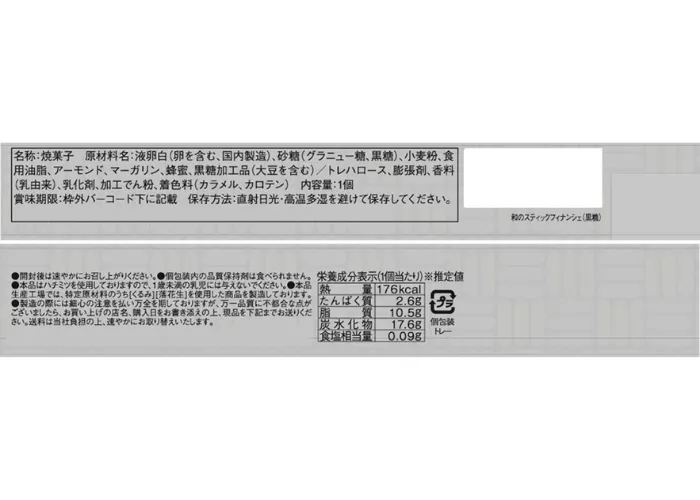 | 原材料名 | 液卵白(卵を含む、国内製造)、砂糖(グラニュー糖、黒糖)、小麦粉、食用油脂、アーモンド、マーガリン、蜂蜜、黒糖加工品(大豆を含む)/トレハロース、膨張剤、香料(乳由来)、乳化剤、加工でん粉、着色料(カラメル、カロテン) |