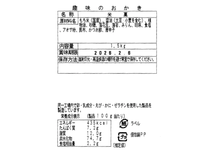 | 原材料名 | もち米(国産)、醤油(大豆・小麦を含む)、植物油、砂糖、落花生、海苔、みりん、胡麻、食塩、アオサ粉、昆布、かつお節、唐辛子 |