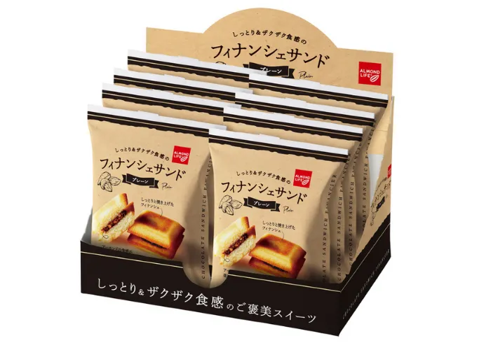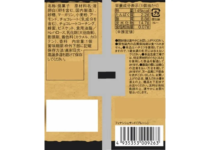 | 原材料名 | 液卵白(卵を含む、国内製造)、砂糖、マーガリン、小麦粉、アーモンド、チョコレート(乳成分を含む)、チョコレートコーチング、蜂蜜、ビスケット、食用油脂/トレハロース、乳化剤(大豆由来)、膨張剤、着色料(カラメル、カロテン)、香料 |