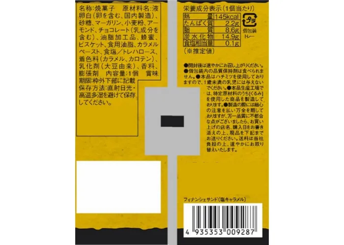 | 原材料名 | 液卵白(卵を含む、国内製造)、砂糖、マーガリン、小麦粉、アーモンド、チョコレート(乳成分を含む)、油脂加工品、蜂蜜、ビスケット、食用油脂、カラメルペースト、食塩/トレハロース、着色料(カラメル、カロテン)、乳化剤(大豆由来)、香料、膨張剤 |