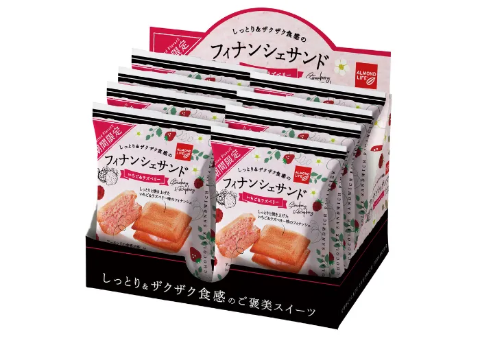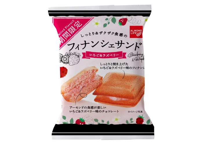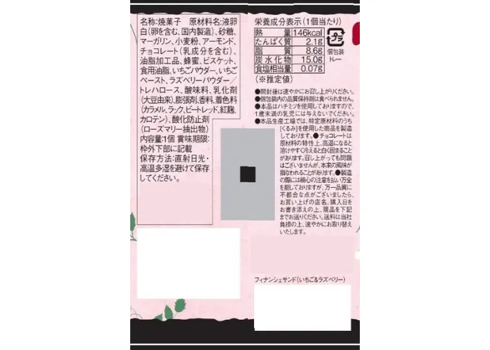 | 原材料名 | 液卵白(卵を含む、国内製造)、砂糖、マーガリン、小麦粉、アーモンド、チョコレート(乳成分を含む)、油脂加工品、蜂蜜、ビスケット、食用油脂、いちごパウダー、いちごペースト、ラズベリーパウダー/トレハロース、酸味料、乳化剤(大豆由来)、膨張剤、香料、着色料(カラメル、ラック、ビートレッド、紅麹、カロテン)、酸化防止剤(ローズマリー抽出物) |