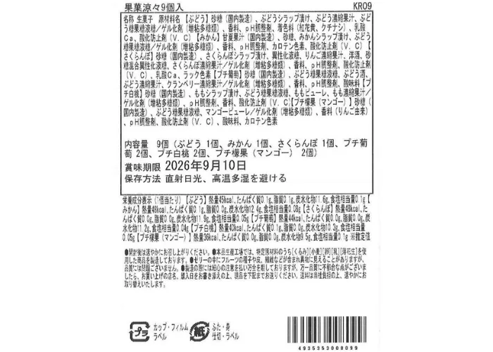 | 栄養成分表示「推定値」 | (1個当たり)【ぶどう】熱量45kcal、たんぱく質0.1g、脂質0.1g、炭水化物11.6g、食塩相当量0.1g【みかん】熱量48kcal、たんぱく質0.1g、脂質0.0g、炭水化物12.4g、食塩相当量0.08g【さくらんぼ】熱量48kcal、たんぱく質0.0g、脂質0.0g、炭水化物11.9g、食塩相当量0.05g【プチ葡萄】熱量44kcal、たんぱく質0.0g、脂質0.0g、炭水化物11.2g、食塩相当量0.04g【プチ白桃】熱量40kcal、たんぱく質0.1g、脂質0.0g、炭水化物10.3g、食塩相当量0.05g【プチ檬果(マンゴー)】熱量36kcal、たんぱく質0.0g、脂質0.0g、炭水化物9.5g、食塩相当量0.1g |