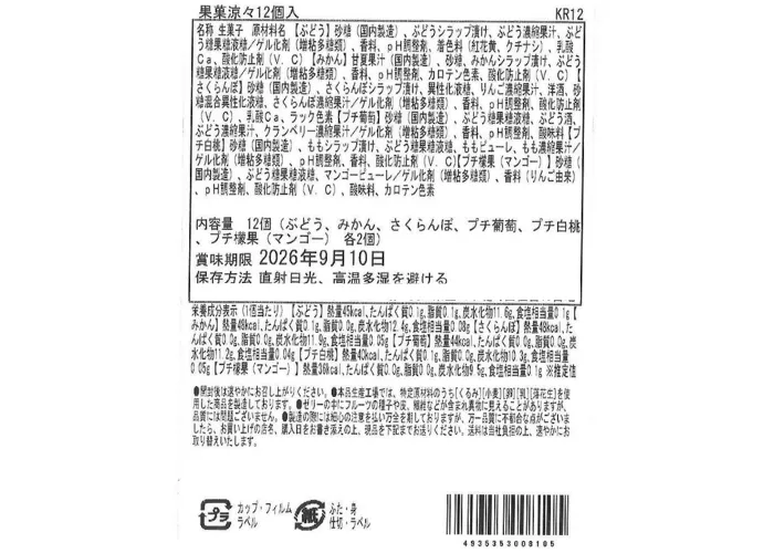 | 原材料名 | 【ぶどう】砂糖(国内製造)、ぶどうシラップ漬け、ぶどう濃縮果汁、ぶどう糖果糖液糖/ゲル化剤(増粘多糖類)、香料、pH調整剤、着色料(紅花黄、クチナシ)、乳酸Ca、酸化防止剤(V.C)【みかん】甘夏果汁(国内製造)、砂糖、みかんシラップ漬け、ぶどう糖果糖液糖/ゲル化剤(増粘多糖類)、香料、pH調整剤、カロテン色素、酸化防止剤(V.C)【さくらんぼ】砂糖(国内製造)、さくらんぼシラップ漬け、異性化液糖、りんご濃縮果汁、洋酒、砂糖混合異性化液糖、さくらんぼ濃縮果汁/ゲル化剤(増粘多糖類)、香料、pH調整剤、酸化防止剤(V.C)、乳酸Ca、ラック色素【プチ葡萄】砂糖(国内製造)、ぶどう糖果糖液糖、ぶどう酒、ぶどう濃縮果汁、クランベリー濃縮果汁/ゲル化剤(増粘多糖類)、香料、pH調整剤、酸味料【プチ白桃】砂糖(国内製造)、ももシラップ漬け、ぶどう糖果糖液糖、ももピューレ、もも濃縮果汁/ゲル化剤(増粘多糖類)、pH調整剤、香料、酸化防止剤(V.C)【プチ檬果(マンゴー)】砂糖(国内製造)、ぶどう糖果糖液糖、マンゴーピューレ/ゲル化剤(増粘多糖類)、香料(りんご由来)、pH調整剤、酸化防止剤(V.C)、酸味料、カロテン色素 |