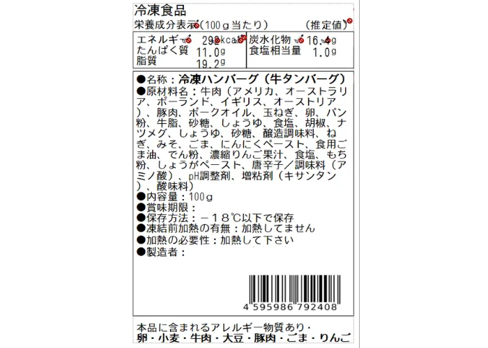 | 原材料名 | 牛肉(アメリカ、オーストラリア、ポーランド、イギリス、オーストリア)、豚肉、ポークオイル、玉ねぎ、卵、パン粉、牛脂、砂糖、しょうゆ、食塩、胡椒、ナツメグ、しょうゆ、砂糖、醸造調味料、ねぎ、みそ、ごま、にんにくペースト、食用ごま油、でん粉、濃縮りんご果汁、食塩、もち粉、しょうがペースト、唐辛子/調味料(アミノ酸)、pH調整剤、増粘剤(キサンタン)、酸味料) |