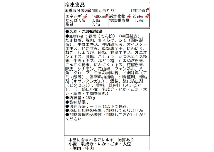 | 原材料名 | 春雨(でん粉)(中国製造)、たまねぎ、豚肉、きくらげ、みそ(国内製造)、牛骨エキス、牛肉調味液、オイスターエキス、いかすみ、乾燥唐辛子、にんにく、ねぎ、しょうが、砂糖、野菜エキス、オニオンエキス、食塩、こしょう、かつおエキス粉末、牛肉エキス、ぶどう糖、たまねぎ粉末、にんにく粉末、にんにくエキス、花椒粉末、陳皮、シナモン、花山椒、フェンネル、八角、クローブ、うまみ調味料、/調味料(アミノ酸等)、香辛料抽出物、pH調整剤、増粘剤(キサンタンガム)、酒精、酸化防止剤(ビタミンE)、香料、甘味料(ステビア)、(一部に小麦・乳成分・いか・ごま・大豆・豚肉・牛肉を含む) |