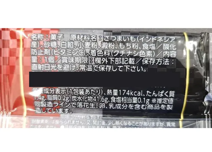 | 原材料名 | さつまいも(インドネシア産)、砂糖、白餡、小麦粉、澱粉、もち粉、食塩/酸化防止剤(ビタミンC)、着色料(クチナシ色素) |