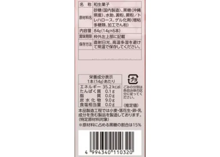 | 原材料名 | 砂糖(国内製造)、黒糖(沖縄県産)、水飴、澱粉、蕨粉/トレハロース、ゲル化剤(増粘多糖類、加工でん粉) |