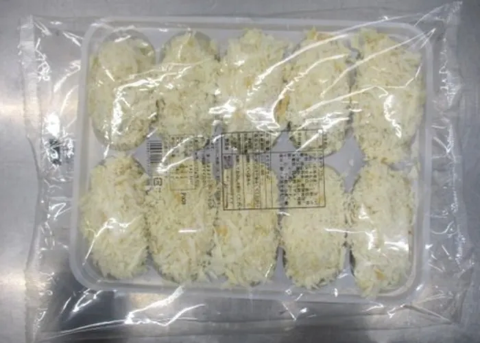 | 原材料名 | かき(広島県産)、衣(パン粉、とうもろこし粉、小麦粉、大豆蛋白、食塩、砂糖、卵白粉末、植物油脂)/加工澱粉、乳化剤、増粘多糖類、調味料(アミノ酸)、イーストフード、V.C、(一部に小麦・乳成分・卵・大豆を含む) |