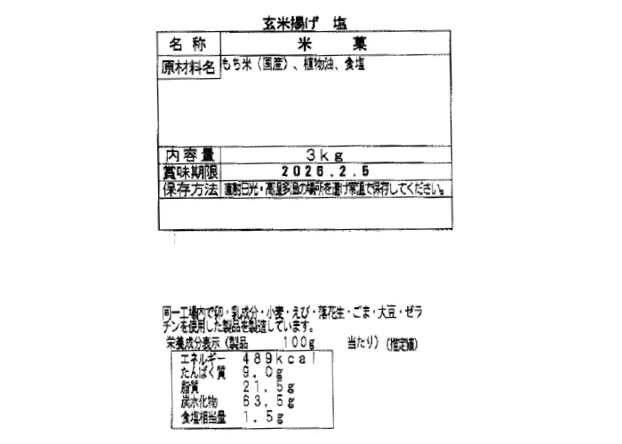 | 原材料名 | もち米(国産)、植物油、食塩 |