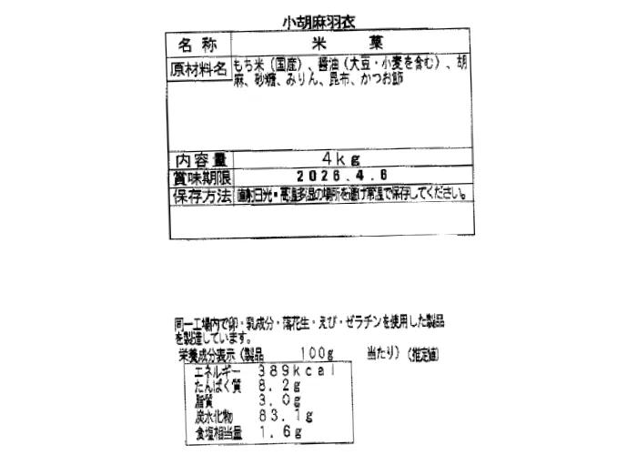 | 原材料名 | もち米(国産)、醤油(大豆・小麦を含む)、胡麻、砂糖、みりん、昆布、かつお節 |