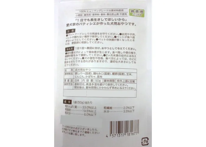 | 栄養成分表示「推定値」 | 1袋(50g)当たり 粗たんぱく質33.0%以上、粗脂肪19.5%以上、粗繊維2.0%以下、粗灰分6.0%以下、水分3.5%以下 |