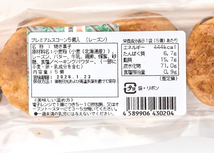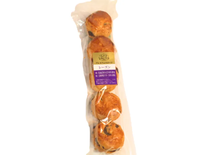 | 原材料名 | 小麦粉(小麦(北海道産))、レーズン、バター、牛乳、鶏卵、蜂蜜、砂糖、食塩/ベーキングパウダー、(一部に小麦・卵・乳成分を含む) |