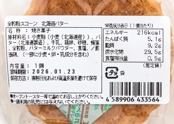 | 原材料名 | 小麦粉(小麦(北海道産))、バター(北海道製造)、牛乳、鶏卵、砂糖、蜂蜜、全粒粉、バターミルクパウダー、食塩/膨張剤、(一部に小麦・卵・乳成分を含む) |