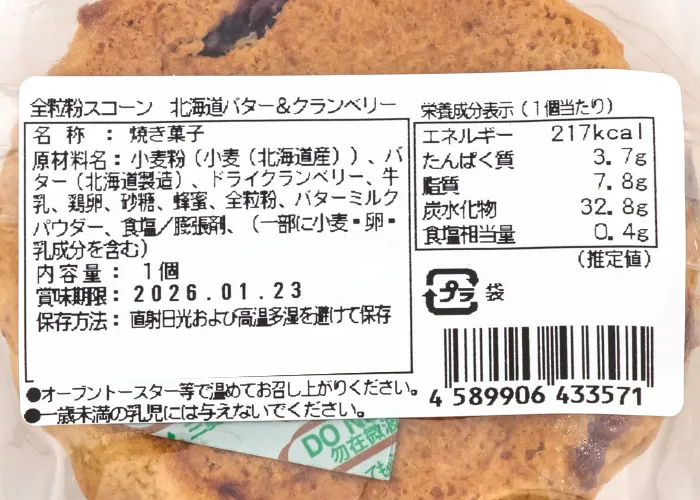 | 原材料名 | 小麦粉(小麦(北海道産))、バター(北海道製造)、ドライクランベリー、牛乳、鶏卵、砂糖、蜂蜜、全粒粉、バターミルクパウダー、食塩/膨張剤、(一部に小麦・卵・乳成分を含む) |