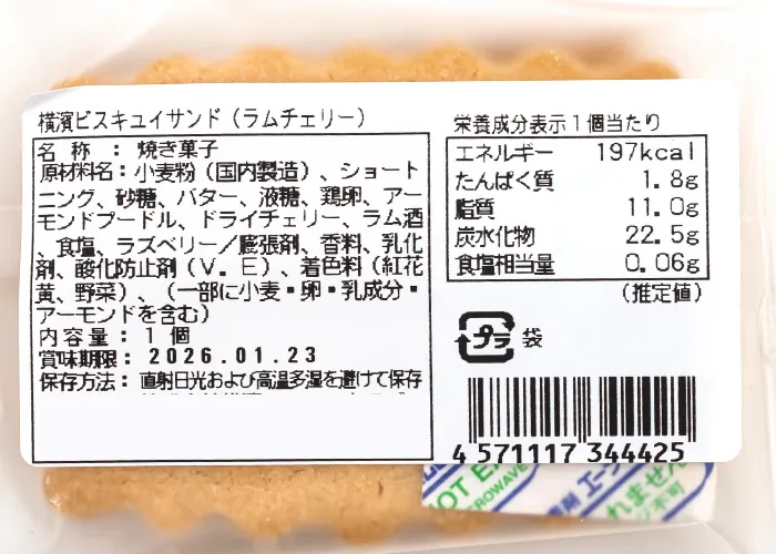 | 原材料名 | 小麦粉(国内製造)、ショートニング、砂糖、バター、液糖、鶏卵、アーモンドプードル、ドライチェリー、ラム酒、食塩、ラズベリー/膨張剤、香料、乳化剤、酸化防止剤(V.E)、着色料(紅花黄、野菜)、(一部に小麦・卵・乳成分・アーモンドを含む) |
