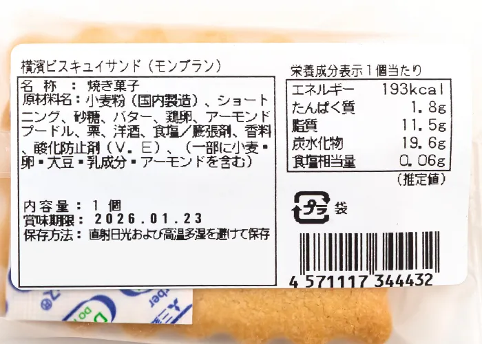 | 原材料名 | 小麦粉(国内製造)、ショートニング、砂糖、バター、鶏卵、アーモンドプードル、栗、洋酒、食塩/膨張剤、香料、酸化防止剤(V.E)、(一部に小麦・卵・大豆・乳成分・アーモンドを含む) |