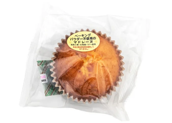 北海道バターを使用して風味豊かに焼き上げました。ベーキングパウダーをはじめ保存料・着色料・香料などの添加物を使用せず原料にこだわったマドレーヌです。