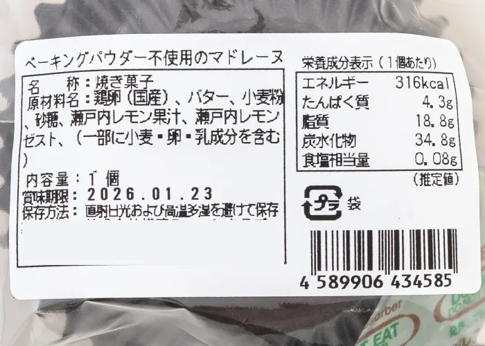 | 原材料名 | 鶏卵(国産)、バター、小麦粉、砂糖、瀬戸内レモン果汁、瀬戸内レモンゼスト、(一部に小麦・卵・乳成分を含む) |