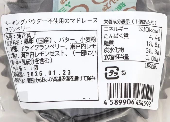 | 原材料名 | 鶏卵(国産)、バター、小麦粉、砂糖、ドライクランベリー、瀬戸内レモン果汁、瀬戸内レモンゼスト、(一部に小麦・卵・乳成分を含む) |