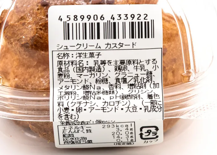 | 原材料名 | 乳等を主要原料とする食品(国内製造)、鶏卵、牛乳、小麦粉、マーガリン、グラニュー糖、アーモンド、粉糖、食塩/乳化剤、メタリン酸Na、香料、増粘剤(加工澱粉、増粘多糖類)、グリシン、ポリリン酸Na、pH調整剤、着色料(クチナシ、カロチン)、(一部に小麦・卵・アーモンド・大豆・乳成分を含む) |