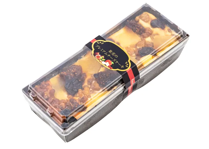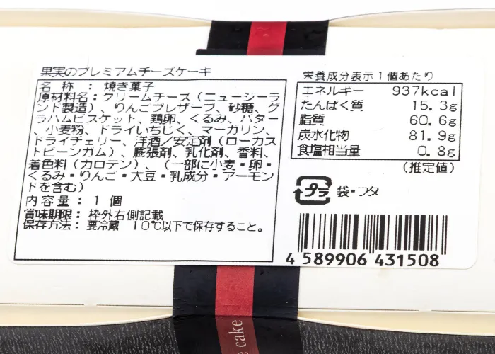 | 原材料名 | クリームチーズ(ニュージーランド製造)、りんごプレザーブ、砂糖、グラハムビスケット、鶏卵、くるみ、バター、小麦粉、ドライいちじく、マーガリン、ドライチェリー、洋酒/安定剤(ローカストビーンガム)、膨張剤、乳化剤、香料、着色料(カロテン)、(一部に小麦・卵・くるみ・りんご・大豆・乳成分・アーモンドを含む) |