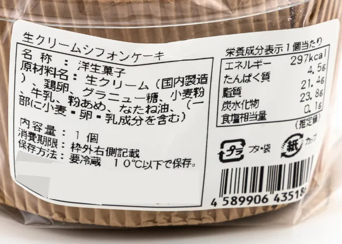 | 原材料名 | 生クリーム(国内製造)、鶏卵、グラニュー糖、小麦粉、牛乳、粉あめ、なたね油、(一部に小麦・卵・乳成分を含む) |